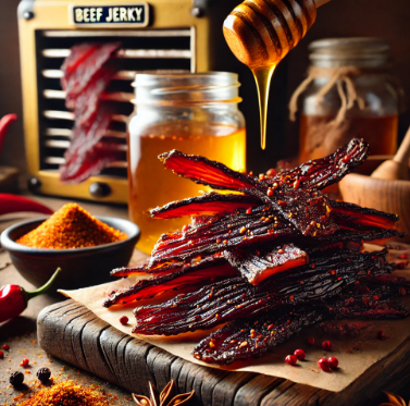 A perfect blend of sweet and heat, this spicy honey beef jerky is a backcountry favorite. With tender strips of bottom-round beef marinated in a smoky, spicy-sweet glaze, it delivers a satisfying chew and a bold, memorable flavor.